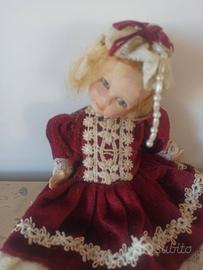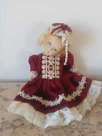 Deliziosa bambola da collezione in porcellana, alta circa 15 cm, con viso dolce e dettagli delicati. Indossa un elegante abito in velluto rosso con pizzi bianchi e fiocco coordinato.