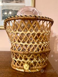 Bambola in porcella altezza 20 cm, con abito in pizzo e raso e piedini smaltati. Seduta in vimini con base apribile tramite apposita chiusura, base 12x8 cm.