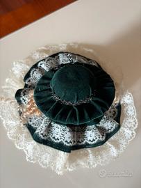 Elegante bambola da collezione con viso in porcellana, lunghi capelli ricci biondi e abito in velluto verde scuro con dettagli in pizzo bianco e fiocco centrale.