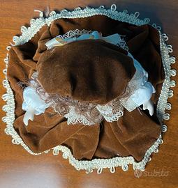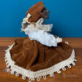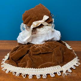 - Difetti da segnalare: marcato gioco nelle articolazioni degli arti, soprattutto nelle gambe, dovuto all’evidente allentamento della legatura interna, tratto frequente nelle bambole vintage. Difetto riscontrabile al tatto, non visibile esternamente per via dei vestiti cuciti. Non pregiudica la posa seduta, ma le braccia non tengono la posizione alzata