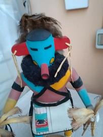 Bambola Kachina autentica realizzata a mano da artista Navajo, firmato sul fondo. In legno, stoffe decorate e pelle. Nella tradizione degli Indiani d' America queste bambole venivano regalate alle donne e ai bambini per essere tenute in casa. Questo rituale permetteva allo spirito di Kachina di vegliare sulla famiglia.Misure h. cm.35,base cm.12.Prezzo affare 80 euro.