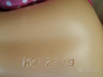 Bellissima bambola vintage di plastica dura, con marchio sulla nuca GP 2075/11- 22(2) e marchio sulla schiena HWT 2279 >PE>. Grandi dimensioni: è alta circa cm 43. Condizione: usato. Condizioni comunque davvero ottime se si pensa che dovrebbe risalire al 1979. Gli abiti che indossa sono originali. Non indossa scarpe. I capelli sono biondi e lunghi legati a coda di cavallo; il capo, le braccia e le gambe sono mobili pur senza piegamenti. Gli occhi sono azzurri, statici , ma molto belli, provvisti di lunghe e bellissime ciglia tridimensionali. Vedere le foto in quanto sono parte integrante della descrizione. Se si desidera l'invio al proprio domicilio, aggiungere al prezzo di vendita euro 12,00 per la spedizione.
