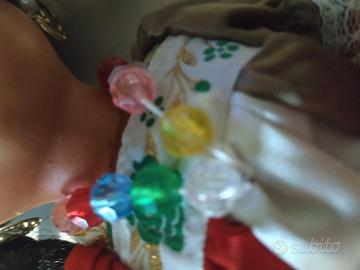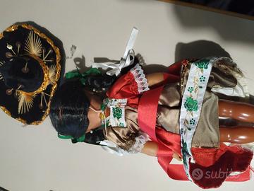 Bambola messicana autentica, acquistata in Messico tra gli anni '70 e '80. Questo pezzo unico è frutto di una manifattura artigianale e misura 31 cm. La bambola ha testa e braccia in gomma, gambe in plastica, e possiede occhi che si aprono e si chiudono. È in grado di muovere sia le braccia che le gambe, e indossa un abito tradizionale in raso con dettagli in pizzo. Arricchita da una collanina con elementi in metallo e perline, è dotata di un elegante sombrero ricamato a mano con paillettes.