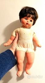 Bambola da collezione "Paciughina", nella versione con i capelli castani e gli occhi azzurri, prodotta nei primi anni '60 da Furga, azienda allora leader nella produzione di giocattoli di alta qualità. Il tronco è in tessuto e all' interno si trovano i meccanismi del carillon e del movimento: la bambola durante il suono del carillon, che si attiva con carica manuale, si muove dolcemente imitando gli atteggiamenti di una neonata in culla. Alla parte in tessuto sono attaccati gli arti e la testa in plastica dura. Nonostante l' età, i meccanismi sono funzionanti, la plastica è ben conservata, i capelli sono folti e lucidi, l'abitino è originale. La parte in tessuto ha alcune macchie, all'occhio destro mancano le ciglia e nell'abitino si è formato qualche piccolo buco, ma nel complesso la bambola è in condizioni più che buone.