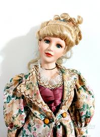Stupenda bambola da collezione anni 90 in confezione originale intatta con nessun danno da segnalare, stile Vittoriano altezza di 53 cm.