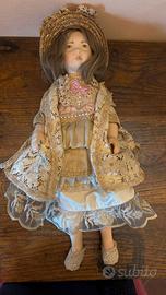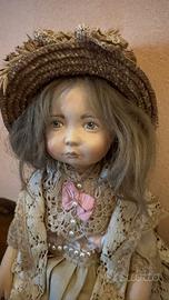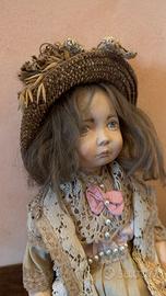 I capelli sono veri, raccolti sotto un ampio cappello di paglia naturale, modellato a mano. Il cappello è decorato con fiori secchi e piccole spighe.
