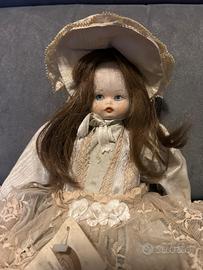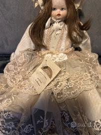 Deliziosa bambola in porcellana, un pezzo da collezione con un elegante abito. Certificato di garanzia fatto a mano da esperti artigiani - Abito in pizzo color crema con dettagli floreali. - Cappello coordinato. - Capelli lunghi castani. - Viso dipinto a mano con occhi azzurri. Volto mani e piedi in porcellana