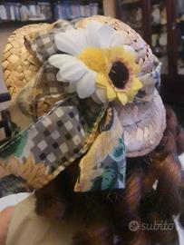Cappello in vera paglia intrecciata naturale (autentica, non sintetica), stile paglietta estiva contadina, decorato con grande girasole giallo centrale, nastro a quadri e fiocchi verdi/gialli – tema sunflower girl iconico del periodo