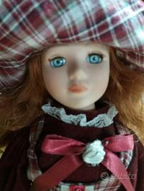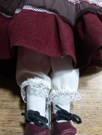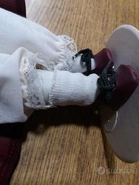 Bambola porcellana perfetta con supporto in ferro vestito e capellino bordeaux in velluto con bordi e grembiule in cotone calze in cotone e scarpine in pelle in tinta con il vestito con piedistallo alta 35 cm