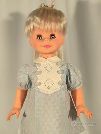 Bellissima bambola della MIGLIORATI anni ‘60, alta cm. 51 circa, con marchio Migliorati Italy sul collo e sulla schiena. Bambola con testa e braccia in vinile, busto e gambe in polietilene, capelli biondi ben radicati, lavabili e pettinabili; occhi azzurri dormienti con lunghe ciglia.