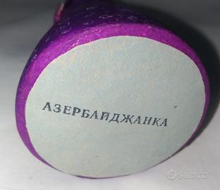 Bambola Russa Papier Mache ( cartapesta) fatta a mano in Russia intorno agli anni 60. Fa parte di una serie di bambole ognuna rappresentante uno stato che componeva l'Unione Sovietica all'epoca, con costumi tradizionali in questo caso del Azerbaijan. Sotto la base della bambola è stampato in cirillico "Azerbaijania" Senza scatola proveniente da una collezione privata in ottime condizioni. Alt. cm 9 larg. Cm 5