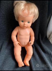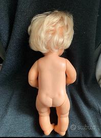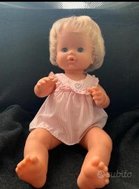 Bambola Sbrodolina anni 80, marchio “ Famosa”. Occhi azzurri cliccanti, capelli biondi e vaporosi, cin alcuni plug mancanti sulla frangia. Vinile morbido e colori perfettamente conservati. Indossa un abitino prendisole a righine rosa.