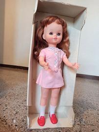 Bambola Singer, nuova con scatola, anni 70. Abbinata con la bambola una piccola macchina da cucire Singer e due vestitini da cucire, nuovi non cuciti, per la bambola.