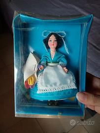 Bambola souvenir vintage di Bergamo, risalente agli anni '60 o '70. Indossa un abito tradizionale azzurro con grembiule bianco e dettagli in pizzo. Bambola in condizioni perfette, conservata in scatola originale un po' ammaccata ma che ne ha preservato l'integrità. Accessori presenti.