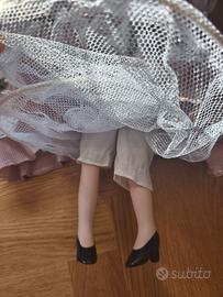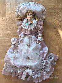 Bella bambola di porcellana integra, stile 800. Abito rifinito con sottogonna in tulle, crinolina. Decorazioni con perline e pizzi. In una mano regge una borsetta.