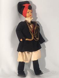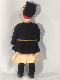 Alta cm 31, si presenta in ottime condizioni, il viso sembra in cartapesta, le braccia in plastica e le gambe sembrano imbottite di panno, è completa di scarpe e il costume in panno lenci e cotone è molto ben rifinito e curato.