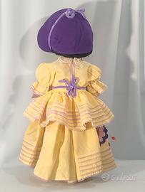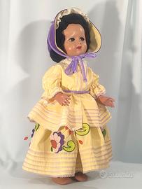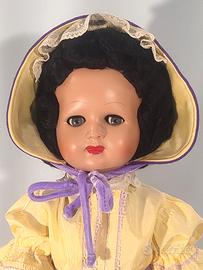 Bellissima bambola italiana risalente agli anni ’40, in ottime condizioni, alta cm. 56 circa, non ha il marchio ma presumo che possa essere una FURGA o una LIALA (prodotta a S. GIULIETTA). Il materiale è composizione (gesso e cartapesta); occhi di vetro grigio-verdi flirty sono cliccanti con apri e chiudi; lunghe ciglia di cotone; capelli mohair neri raccolti in una deliziosa acconciatura ed un luminoso incarnato. Favoloso l’abbigliamento: indossa un completino (penso sia raso misto a seta) giallo chiaro con inserti di pizzo color lilla; l’abito ha delle deliziose applicazioni in pannolenci e la giacchina ha il colletto in pizzo bianco lo stesso della cuffietta che è in pannolenci come pure le scarpine, i calzini sono attaccati alle gambe. La bambola è in buone condizioni, con normali segni dovuti al tempo ma niente di importante, le foto, secondo me, non rendono giustizia alla bellezza di questa bimba! GUARDATE LE FOTO PER UNA MIGLIORE DESCRIZIONE. Posso consegnare ad Ancona e limitrofi, concordando con massima serietà Oppure spedire in tutta Italia