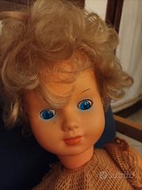 Bambola anni 50 in plastica alta cm 75 completa di scarpe originali, vestito non originale ma fatto all'uncinetto su misura. Slip incollati alla plastica. Gli elastici delle gambe e della testa hanno ceduto e sono lenti( solo da cambiare), unica rottura nel corpo vicino alla gamba sx, come da foto. Occhi si muovono( se si sdraia la bambola si chiudono). Non vedo marche, unica scritta dietro nel collo 'Brev'. Vista e piaciuta nello stato in cui si trova.