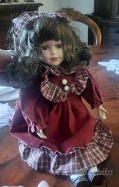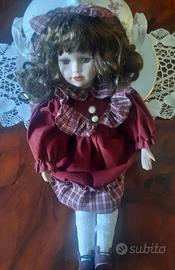 Bellissima bambola vintage senza marchio anni 70/80. Viso e arti in ceramica dipinta, abito bordeaux stile vittoriano rustico, bellissimi capelli ricci castani e acconciatura con nastro, occhi molto espressivi. Altezza cm.42. Ottime condizioni.