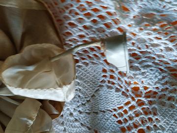 bambola marchio m.c. Italy n.2. altezza 28 cm. ha la testa in carta in cartapesta. cappello. mani colletto e corsetto in pannolenci, gonna in seta sottogonna in cotone. Braccia e gambe in filo di ferro