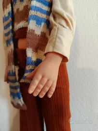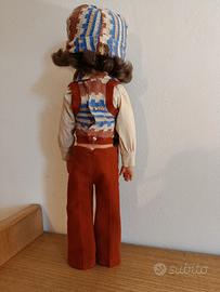 Rara bambola vintage originale degli anni '70, prodotta dalla storica manifattura italiana Bambole Ceccon. Il pezzo presenta il marchio "cb" sulla nuca e la dicitura "Made in Italy" sulla schiena. 👗 Outfit: Completo originale stile anni '70 composto da pantaloni in velluto a coste marroni, gilet, sciarpa e cappello in maglia con motivo geometrico azzurro, bianco e marrone. ✨ Dettagli: Viso curato con grandi occhi azzurri, ciglia folte e lunghi capelli castani mossi. 🔎 Condizioni: Ottimo stato conservativo, ideale per collezionismo o amanti del modernariato.