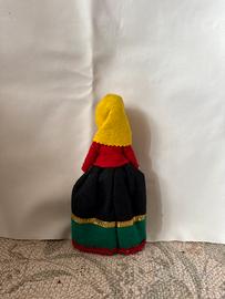 Vendo bellissima bambola vintage da collezione realizzata interamente a mano con abiti in feltro e panno. La bambolina indossa un accurato costume tradizionale regionale (probabilmente Sardegna o Centro-Sud Italia), caratterizzato da colori vivaci e dettagli minuziosi.