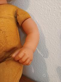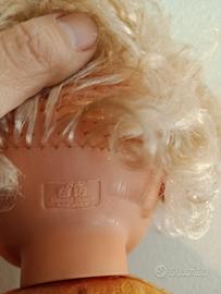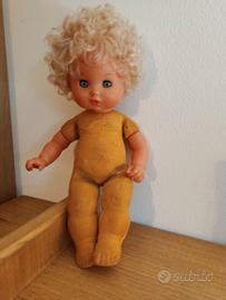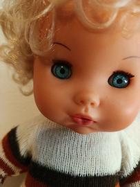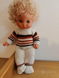 Splendida bambola vintage prodotta dalla storica azienda italiana EFFE (Bambole Franca). Un pezzo autentico di artigianato, perfetto per collezionisti del settore o per chi cerca un ricordo d'infanzia originale e ben conservato. 💎 Dettagli: Corpo in spugna morbida, testa e arti in vinile di alta qualità. Marchio di autenticità visibile sulla nuca. 👱🏻♀️ Estetica: Capelli biondi ricci originali, occhi azzurri limpidi con ciglia integre e lineamenti delicati. 👕 Outfit: Indossa la sua tutina in maglia a righe colorate originale dell'epoca. ✨ Condizioni: Ottime condizioni vintage. Struttura integra e colori del viso ancora molto vividi.