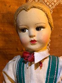 Splendida bambola d’epoca prodotta dalla storica ditta Eros Florence, famosa per la realizzazione di bambole artigianali di alta qualità. La bambola è vestita con un tradizionale costume tirolese, composto da pantaloni verdi con bretelle decorate da stelline, camicia in tessuto leggero e graziosi stivaletti con calzettoni intrecciati.