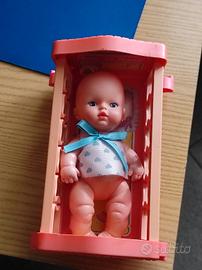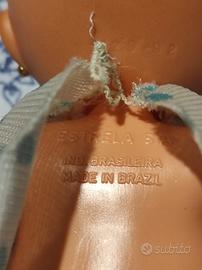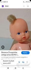 Bambola vintage Estrela, parte della collezione "Chuquinhas", nello specifico il modello "Chuquinhas No Bercinho" (Chuquinhas nella culletta). Produttore: Estrela, un marchio di giocattoli brasiliano famoso. La bambola è un piccoli neonato in vinile alloggiato in una culla di plastica rosa. Sulla confezione dellai culla è riportata la scritta "Hora de Naná" (Ora della nanna).