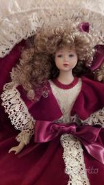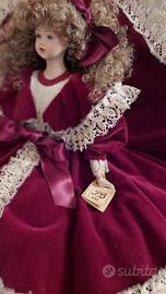Bambola vintage FB Elite in autentica porcellana fine, snodabile realizzata in Italia. Questa splendida bambola è elegantemente vestita in velluto rosso intenso, pizzo e splendide rifiniture in tessuto con rosso intenso e ricchi toni della terra.