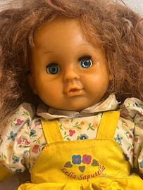 Descrizione: Splendida bambola Lella Saputella originale della Migliorati, pezzo cult degli anni '80. La bambola indossa il suo grembiulino giallo originale con ricamo "Lella Saputella" e fiori colorati. Capelli ricci ramati folti e occhi azzurri.
