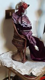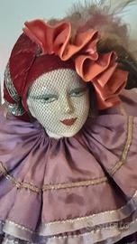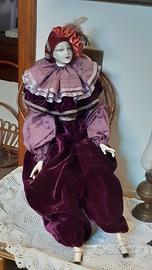 Grande bambola Pierrot vintage anni 70.Testa, mani,piedi in porcellana.Il corpo stoffa ripiena.Il viso dipinto impreziosito da turbante con piume e velina.
