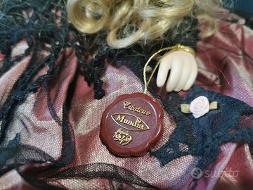Bambola vintage in porcellana abito pizzo nero e rosa con scarpine pizzo nero. Altezza 50 cm.