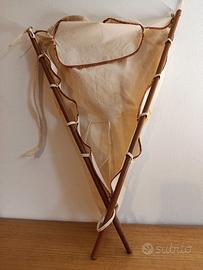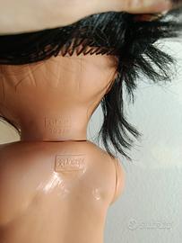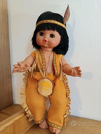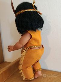 Magnifica bambola Furga vintage raffigurante Winnetou, l'iconico capo Apache. Pezzo da collezione conservato con cura, pulito e pronto per l'esposizione. ✨ Dettagli: Viso espressivo con pittura originale; capelli folti con fascia e piuma. 🏹 Outfit: Costume originale in feltro ocra con decorazioni geometriche e frange. 🪆 Accessori: Include la rara culla a sacco (papoose) con stampa "Winnetou" e aste in legno. 🛡️ Stato: Ottimo stato vintage; lievi e naturali segni del tempo documentati in foto.