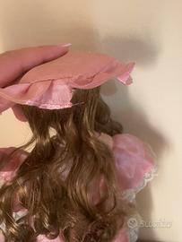 La bambola a destra ha capelli castani lunghi e mossi, indossa un cappello rosa, un abito rosa con dettagli in pizzo, una collana di perle e tiene in mano una piccola borsetta bianca. Ha un piedistallo che la fa mantenere in una posa eretta.