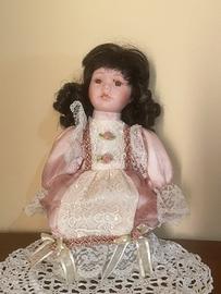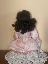 La bambola a sinistra ha capelli scuri e ricci, un vestito rosa chiaro con inserti in pizzo crema e dettagli floreali. Non si regge molto bene, ma appoggiata a una superficie o con un contenitore/bicchiere sotto al vestito si mantiene bene e non si nota.