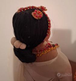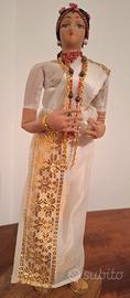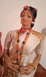 Coppia di bambole vintage da collezione originali dell'India meridionale/ Sri Lanka. Indossano abiti tradizionali decorati minuziosamente e ornati con collane copricapo ecc.
