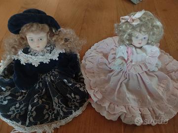 Due bambole altezza 25 cm in piedi e 18 cm sedute in porcellana con vestiti fatti a mano ottime fatture.