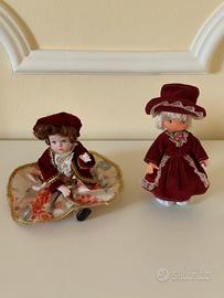 - bambola con giacca in velluto bordeaux, passamaneria dorata e gonna in tessuto operato con fantasia floreale (altezza 19 cm): testa, braccia, gambe in porcellana.