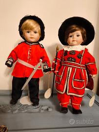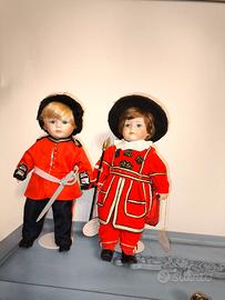 2 bambole di PORCELLANA della Guardia della Regina in uniforme britannica. Vintage. Entrambe della collezione Leonardo. 20 cm di larghezza x 37 di altezza.