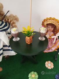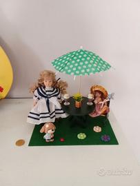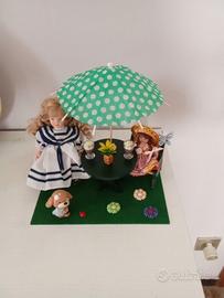 Bamboline in ceramica in giardino sotto l'ombrellone con accessori in miniatura nuovo. Solo la bambolina dal vestito bianco e blu e Doll's house collection.