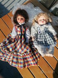 La bambola nella prima foto, molto grande, è sicuramente in porcellana, visto che ha ancora il cartellino dove viene dichiarata come tale. Non sono riuscito a risalire alla marca, ma nel cartellino è presente una N in un font stile napoleonico. Probabilmente lo sono anche le altre due più piccole, ma non ne sono certo. Condizioni in generale più che buone, ottime per quanto riguarda la bambola più grande