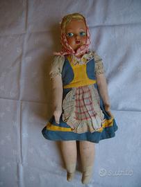 Antica Bambola Olandese, produzione artigianale, con testa e spalle in cartapesta e corpo in tessuto imbottito di sottili trucioli di legno. Altezza cm 45. Viso dipinto, arti fissati con perni metallici, capelli di seta, a 40,00.