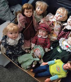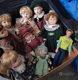 Questa collezione di bambole include diversi pezzi vintage in porcellana e un personaggio moderno ben riconoscibile. Identificazione della Bambola Ken La figura maschile sulla destra è ilConcert Date Kenprodotto daMattel nel 2001. È facilmente identificabile grazie al suo outfit originale: Maglia:Una maglia a maniche lunghe verde lime con maniche azzurre e una stampa frontale con il numero87-63. Pantaloni:Pantaloni blu con risvolto. Scarpe:Mocassini neri. Bambole di Porcellana e Ceramica La scatola contiene diverse bambole vintage in stile vittoriano o d'epoca, caratterizzate da teste e arti in porcellana biscuit e corpi imbottiti. Bambola con vestito scozzese (al centro):Simile a modelli di collezioni comeSeymour MannoDan Dee International Ltd, spesso vestite con abiti a quadri rossi e verdi. Bambola con vestito verde (a destra):Condivide lo stile delle bamboleThe Promenade Collection, come il modello "Alice", note per i loro abiti eleganti in velluto o tessuto con bordi in pizzo. Bambola bionda (in alto a sinistra):Presenta tratti tipici delle produzioniGiGo ExpressionoHeritage Mint, spesso raffiguranti bambini con espressioni realistiche e occhi azzurri. IN BUONE CONDIZIONI