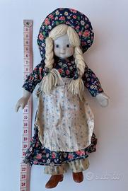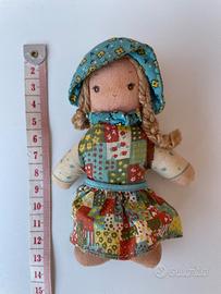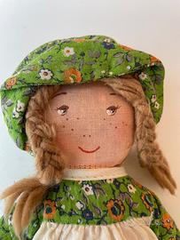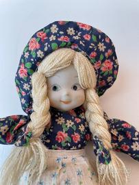 Lotto di 3 bambole vintage da collezione, perfette per amanti dello stile country e nostalgici degli anni '70/'80. Il set comprende due autentiche Ragdolls della Knickerbocker e una bambola in porcellana: Holly Hobbie (Mini) Alta 12 cm, originale anni ’70: Bambolina di pezza originale Knickerbocker Toy Co. Corpo in stoffa, capelli in lana intrecciati, vestito patchwork con cuffietta azzurra. Condizioni vintage eccellenti. Etichetta originale presente e leggibile. Amy (Amica di Holly Hobbie) Alta 25 cm (Versione media) originale anni ’70: Bambola di pezza originale Knickerbocker anni '70. Indossa il suo iconico abito verde a fiori con cuffietta coordinata e capelli in lana. Senza etichetta ma modello originale garantito. Bambola in porcellana. Alta 22 cm, Stile country/alpino: Viso, mani e piedi in porcellana biscuit, arti flessibili, corpo morbido e imbottito e capelli in lana. Abito floreale blu scuro con grembiule e cuffietta. Porcellana integra, leggero segno sul viso, ma senza crepe o rotture. Senza marchio (unbranded). Bambole personali della mia infanzia, pulite e lavate con cura! Ottime condizioni vintage. Peso totale lotto: 170 grammi