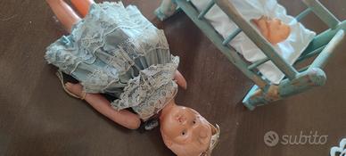 Giocattoli bambolina e culla. Bambolina prime plastiche, culla in legno. Misure rispettivamente 23x13 e 27x10. Prezzo su offerta.