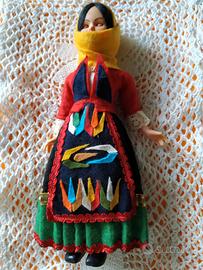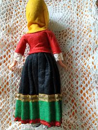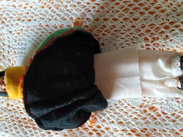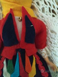 bambola altezza cm. 28, marchio 27 s , apre e chiude gli occhi, testa in celluloide, corpo in plastica, abito in pannolenci con pizzo sulle maniche e fondo pantaloni, bordure rosse sul grembiule e fondo gonna, bordura dorata a 3/4 della gonna, capelli di lana, piccola spilla sotto il collo