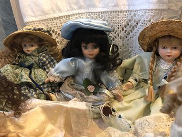 N. 5 bamboline in ceramica n. 2 alte 23 cm in piedi e 16 cm sedute, le rimanenti 3 alte 20 cm in piedi e 14 cm sedute. Presenze di alcune macchie sui pantaloncini dove erano appoggiate al mobile.
