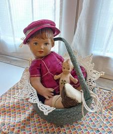 Due bambolotti, cm 34 di altezza per il più grande, con abitino autentico: ha solo da riagganciare l' elastico della testolina e delle gambe; cm 10,5 il più piccolo, come si può vedere nell' immagine, c' è solo da restaurare lo smalto di una piccola zona di un braccio. Giocattoli da bambina del 1915. La poltroncina fa parte di un salottino tirolese completo che si può vedere in un altro annuncio.