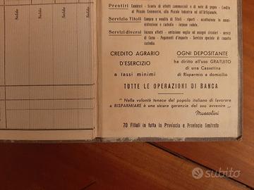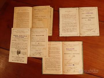 In vendita n. 3 Libretti di deposito a risparmio emessi dalla Agenzia di Rivarolo Mantovano: 1) Piccolo Risparmio del 6.2.39 utilizzando Libretto della precedente Banca Mutua Popolare di Mantova ( fusa nella Banca Agricola Mantovana in data 4.12.32). Logo in rilievo BAM in copertina. Allegato memorandum delle operazioni offerte dall’Istituto; 2) 24.12.42 . In ultima pagina dettaglio operazioni offerte dall’Istituto e frase di Benito Mussolini sul risparmio; 3) 6.6.41. In ultima pagina dettaglio delle operazioni offerte dall’Istituto. Condizioni di tenuta esterne che risentono dei tanti anni passati con tracce di umido rappreso sulle copertine, ma interni perfetti. Disponibili ulteriori immagini ed informazioni su richiesta. Spedizione piego di libri raccomandata inseriti in rivista priva di valore commerciale.